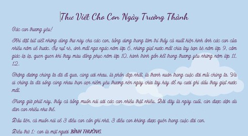 Khi đặt bút viết những dòng thư này cho các con, bỗng dưng trong tâm trí thầy cô xuất hiện hình ảnh các con của nhiều năm về trước. Sự rụt rè, ánh mắt ngơ ngác năm lớp 6, những giọt nước mắt chia tay bạn bè năm lớp 9, cảm giác lạ lạ, quen quen khi thay màu đồng phục năm lớp 10, hành trình gắn kết trong thương yêu những năm lớp 11, 12.
